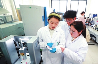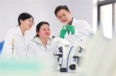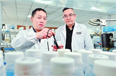 在上海昊岳生物科技有限公司,揚州大學食品科學與工程學院校友茅凱東(右)帶領團隊成員對“太空益生菌”產品進行技術升級與創新研發。 學校供圖