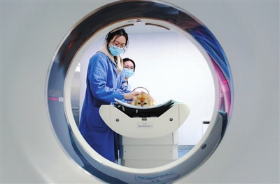 在醫護人員的指導下,揚州大學獸醫學院學生走進動物醫院進行創業實習,為寵物做CT檢查。