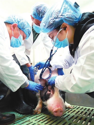 揚州大學“青禾獸醫”團隊成員在指導教師劉鵬剛(左)的帶領下,深入動物房開展科技創新項目研究,對生豬進行健康檢查。