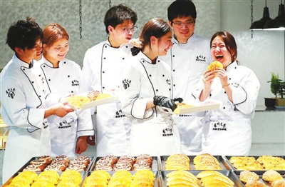 揚州大學旅游烹飪學院“牛烘烘”西點房創業團隊在學校創業苗圃開展產品研發和品鑒。