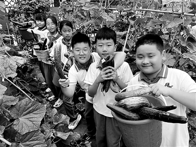 山東省濟寧學院附屬小學學生展示收獲的黃瓜。學校供圖