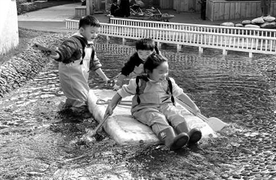圖① 幼兒在自制小船上劃行。