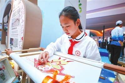 4月26日,第八屆中小學生藝術展演活動全國匯演實踐活動成果(工作坊)展示現場,湖南省長沙市雨花區育新小學學生在進行湘繡非遺展示活動。 本報記者 單藝偉 攝