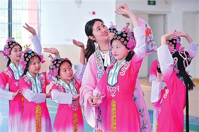 5月8日,在四川省眉山市仁壽縣鰲峰小學校,戲曲教師正在指導學生練習戲曲。近年來,該校將傳統戲曲引進校園,通過社團活動、主題課程、集中展演等形式,讓學生感受傳統文化的魅力。潘建勇 攝