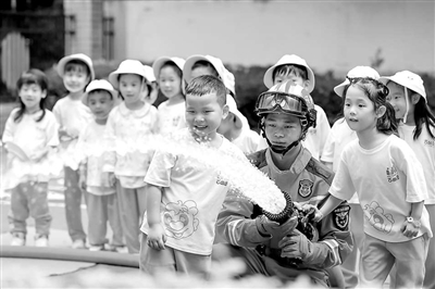 5月9日,福建省福州市鼓樓區水部街道吉的堡幼兒園,孩子們在消防救援人員的協助下體驗使用消防水槍。謝貴明 攝