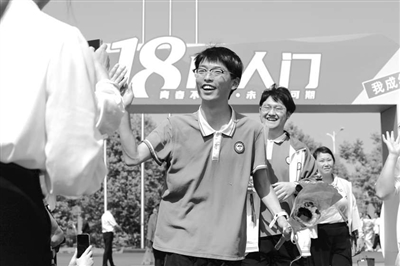 成人禮儀式上,學(xué)生們走過(guò)“成人門”后與教師擊掌。