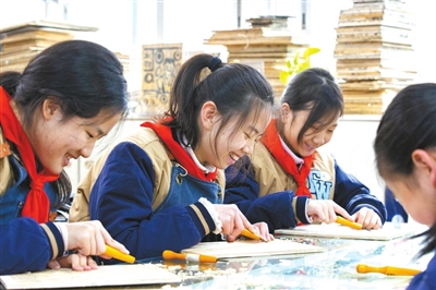 近日,記者走進學校“甲馬木刻版畫工作坊”社團興趣課,學生們用小刻刀在木板上刻印作畫,草稿圖上有動物、有人物、有傳統節日符號等,大家一次次推出木屑,在時而抬頭的交流中綻放歡笑,更多時候則是沉浸其中,專注創作。