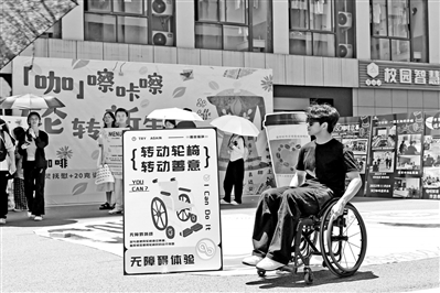 在無障礙體驗區,學生感受輪椅上的世界,轉動的不只是車輪,更是對無障礙社會建設的思考。 胡揚輝 張貝貝 攝