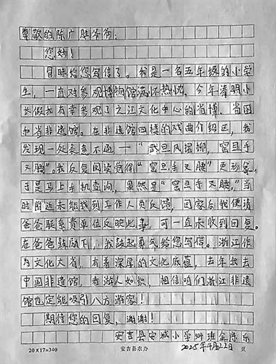 原來(lái),金陳樂(lè)和家人一起到之江文化中心參觀時(shí)發(fā)現(xiàn)了一個(gè)錯(cuò)別字,在父親的鼓勵(lì)下,他寫(xiě)信給陳廣勝?gòu)d長(zhǎng)希望能把這個(gè)錯(cuò)別字改掉。令人意想不到的是,信寄出后沒(méi)幾天他便收到了回信,陳廣勝在信中告知錯(cuò)別字已修改并向金陳樂(lè)表示感謝。