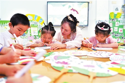6月20日,夏至即將到來,在湖北省襄陽市保康縣縣直機關第二幼兒園,教師指導孩子畫團扇。楊韜 龔雪 攝