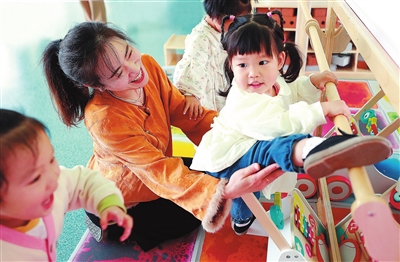 在長(zhǎng)島實(shí)驗(yàn)幼兒園,教師悉心陪護(hù)孩子們玩耍。