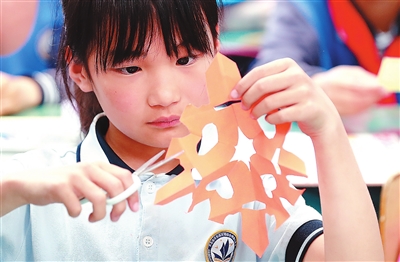 課后服務(wù)時(shí)間,長(zhǎng)島第一實(shí)驗(yàn)學(xué)校學(xué)生學(xué)習(xí)剪紙。