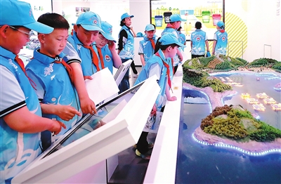 在長(zhǎng)島海洋生態(tài)文明展覽館,長(zhǎng)島第一實(shí)驗(yàn)學(xué)校學(xué)生進(jìn)行研學(xué)實(shí)踐。
