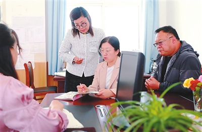 在長(zhǎng)島北長(zhǎng)山鄉(xiāng)中心小學(xué),來自煙臺(tái)市福山區(qū)的支教教師臧巧玉(右三)和當(dāng)?shù)亟處熃涣鹘虒W(xué)經(jīng)驗(yàn)。