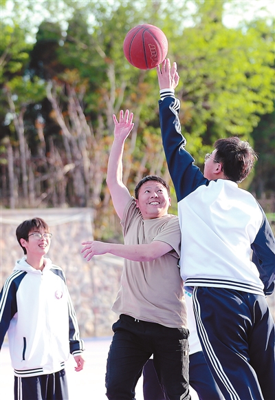 長(zhǎng)島中學(xué)課外活動(dòng)時(shí)間,來自山東省蓬萊第二中學(xué)的支教教師郭子軍和學(xué)生一起打籃球。