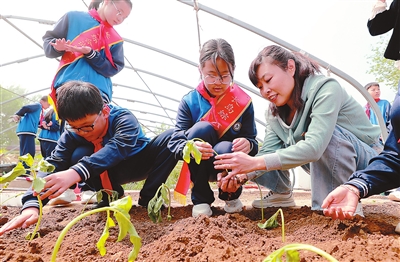 在長(zhǎng)島第二實(shí)驗(yàn)學(xué)校舉辦的“海娃耕讀園”春季開耕節(jié)上,教師指導(dǎo)學(xué)生栽種向日葵。