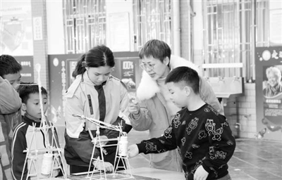 在桂林市平山小學2024年科技節STEAM項目比賽中,李荔平老師指導學生調試“投石機”。 資料圖片