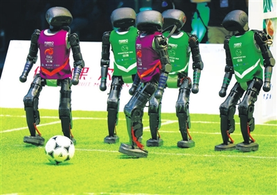 6月28日,中國首場機器人足球3V3 AI賽舉行,參賽機器人通過AI操控實現自主踢球。共有來自北京信息科技大學Blaze光熾隊、清華大學未來實驗室Power智能隊、清華大學火神隊、中國農業大學山海隊的4支機器人隊伍角逐綠茵場。最終,清華大學火神隊以5∶3奪得冠軍,中國農業大學山海隊獲得亞軍,清華大學未來實驗室Power智能隊與北京信息科技大學Blaze光熾隊并列獲得季軍。