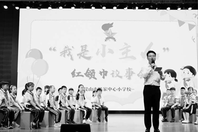 昆山市陸家中心小學(xué)校開展的“我是小主人”紅領(lǐng)巾議事會活動(上圖);該校協(xié)同南京師范大學(xué)心理學(xué)院及泗橋社區(qū)開展的親子活動(下圖)。 徐薛煒攝