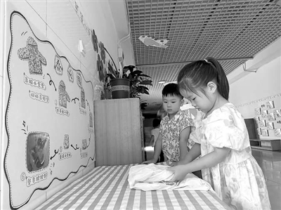 幼兒按照?qǐng)D示自主疊衣服。幼兒園供圖