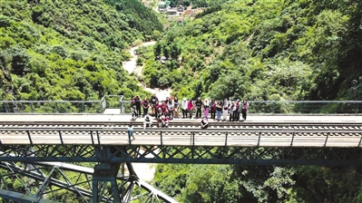 北京大學新聞與傳播學院“行走的人”調研團隊在滇越鐵路標志性路段白寨大橋上。 張祺祺 邱佳陽 攝