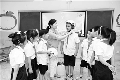近日,江蘇省太倉(cāng)市科教新城實(shí)驗(yàn)小學(xué)教師指導(dǎo)學(xué)生正確佩戴安全頭盔。計(jì)海新 攝