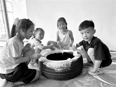 雄安容西望泉小學學生在上輪胎畫實踐課程。王東來 攝