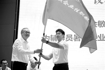 西南交通大學黨委書記余敏明為輔導員暑期企業掛職鍛煉實踐隊授旗。葛仁鑫 攝