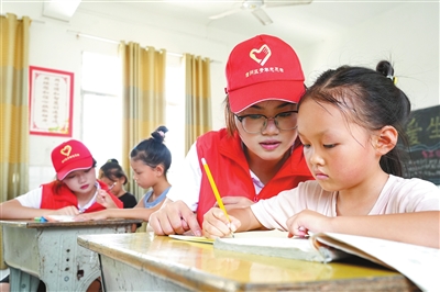 7月18日,在江西省吉安市吉州區曲瀨鎮彭家坊小學,大學生志愿者正在輔導留守兒童作業。今年暑期,共青團江西省吉安市吉州區委選派10多名大學生在彭家坊小學開展為期15天的支教活動,豐富留守兒童的暑期生活。李軍 攝
