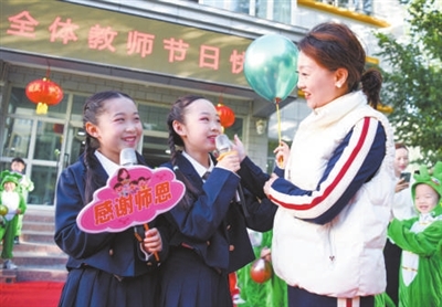 在新疆教育學院實驗小學校園,學生為老師獻歌送上教師節的祝福。 資料圖片