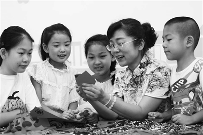 在河北省唐山市豐潤區燕山路街道建華二社區暑托班上,剪紙藝人在指導孩子們學習剪紙。 通訊員 朱大勇 攝