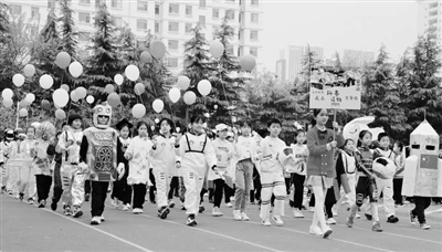 山東省臨沂樸園小學讀書節開幕式上,四年級“科普讀物”方隊入場。 學校供圖