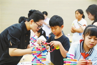 7月25日,合肥綜合性國家科學中心大健康研究院工作人員輔導孩子們組裝DNA雙螺旋結構模型。當日,合肥綜合性國家科學中心大健康研究院開展“生物科普研學營”活動,讓孩子們在探索學習中感受生物科技的魅力。