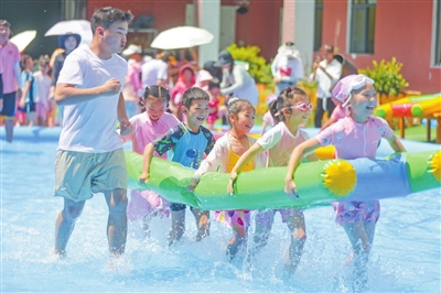 日前,貴州省貴陽市開陽縣東山幼兒園開展了親子戲水活動,現場熱鬧非凡。家長和孩子們參加七彩泡沫、水槍大戰等項目,在趣味游戲中享受清涼。圖為孩子們手持“闖關氣墊”向前沖刺。