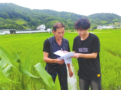 寧波財(cái)經(jīng)學(xué)院“數(shù)智賦能鄉(xiāng)村”暑期社會(huì)實(shí)踐團(tuán)成員(右)在調(diào)研農(nóng)民需求。學(xué)校供圖