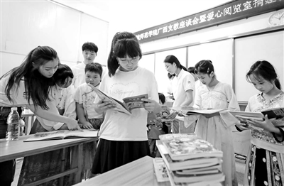 8月1日,地處大山深處的廣西興安縣高尚鎮(zhèn)中心校收到來自黃海之濱的鹽城師范學院師生捐贈的上千冊圖書。圖為高尚鎮(zhèn)中心校學生翻閱鹽城師范學院師生捐贈的圖書。