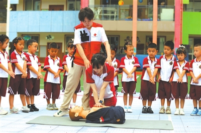 日前,四川省樂山市惠靈幼兒園開展“珍愛生命 預防溺水”安全教育活動。樂山市市中區紅十字會應急救護志愿者通過模擬溺水救援等環節,為教師及幼兒普及防溺水相關知識,增強幼兒的安全意識,提高幼兒的自救能力。圖為教師在志愿者指導下演示心肺復蘇。李華時 彭一淇 攝