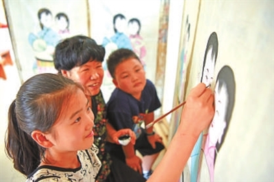 8月1日,在山東省高密市,小朋友在撲灰年畫代表性傳承人王樹花(左二)的指導下學習繪制技巧。李海濤 攝