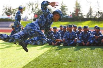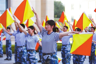 “注意!右上左平,左臂舉高,像正步擺臂一樣!”隨著教官鏗鏘有力的口令,來自全國各地的青年學員高舉紅黃手旗,整齊劃一地揮舞手臂,動作剛健有力、節奏分明,一揮一舞間傳遞出特定的海軍信號。這是第十屆全國學生軍事訓練營火熱開展中生動的一幕。