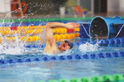 在水上訓練中,學員需要通過設在水面上的不同障礙物,游向終點。劉丞 攝