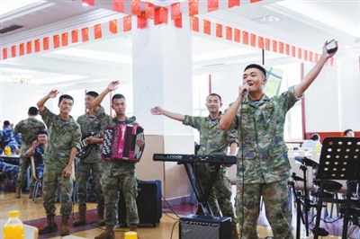 在中國人民解放軍建軍98周年之際,學員在會餐活動中深情獻唱。 馮子琪 攝