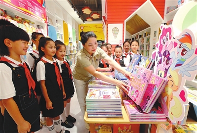 書店工作人員在給小朋友介紹整理書籍的方法。