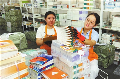 8月12日,工作人員在河北省新樂市新華書店倉庫整理清點中小學教材,準備送往各學校。賈敏杰 攝
