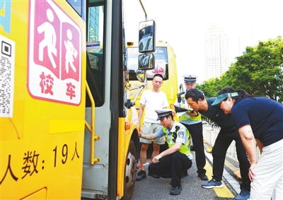 8月22日,湖北省武漢市武昌區交通大隊民警對校車進行安全檢查。