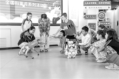 近日,在新疆烏魯木齊市科技館,孩子們在與機器狗互動。 孫振嵩 攝