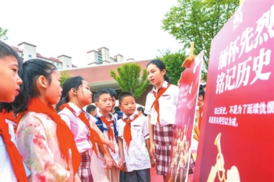 江蘇省海安高新區(qū)實(shí)驗(yàn)小學(xué)學(xué)生在校園內(nèi)參觀弘揚(yáng)偉大抗戰(zhàn)精神海報(bào)展。翟慧勇 攝