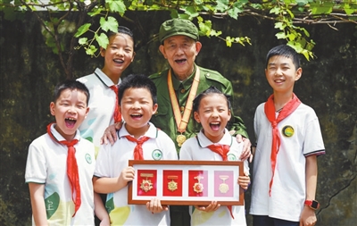 安徽省合肥市中小學(xué)生代表與抗戰(zhàn)老兵合影。徐偉 攝