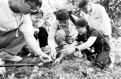 山東中醫(yī)藥大學(xué)藥學(xué)院師生在采集黃芪標(biāo)本。