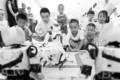 近日,在重慶市北碚區(qū)水土街道和澤家園社區(qū)微型少年宮,孩子們在和機器人互動。秦廷富 攝
