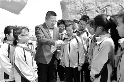 東營市東營區第二中學校長張曉亮和學生在黃河口研學。 王鵬 攝